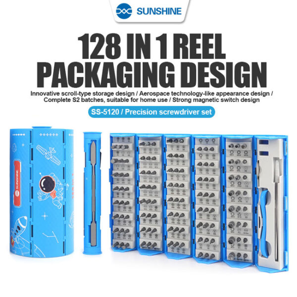 Σετ κατσαβιδιών της Sunshine το οποίο αποτελείται από μαγνητικό κατσαβίδι, προέκταση, μαγνητιστή, τσιμπίδα, καρφίτσα εξαγωγής, εργαλεία ανοίγματος και 120 διαφορετικές μύτες κατσαβιδιού.