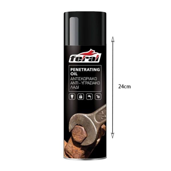 To αντισκωριακό λάδι Feral, είναι ένα προϊόν μοναδικής σύνθεσης, το οποίο καθαρίζει βρομιές και σκόνη, απαλλάσσει από τη σκουριά και τα άλατα, διεισδύει σε παγωμένα μέρη, λιπαίνει και παρατείνει την ζωή των μηχανημάτων. Δρα άμεσα απομακρύνοντας την υγρασία, στεγνώνοντας υγρές συνδέσεις, αφήνοντας ένα προστατευτικό φιλμ που προφυλάσσει από την σκουριά.