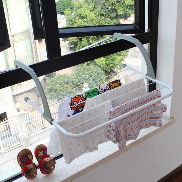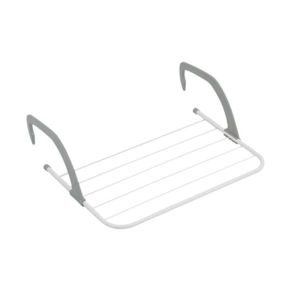 Απλώστρα ρούχων αλουμινίου με πλαστικές βάσεις σταθερής τοποθέτησης στο οριζόντιο κάγκελο και πρακτικό σχεδιασμό.
