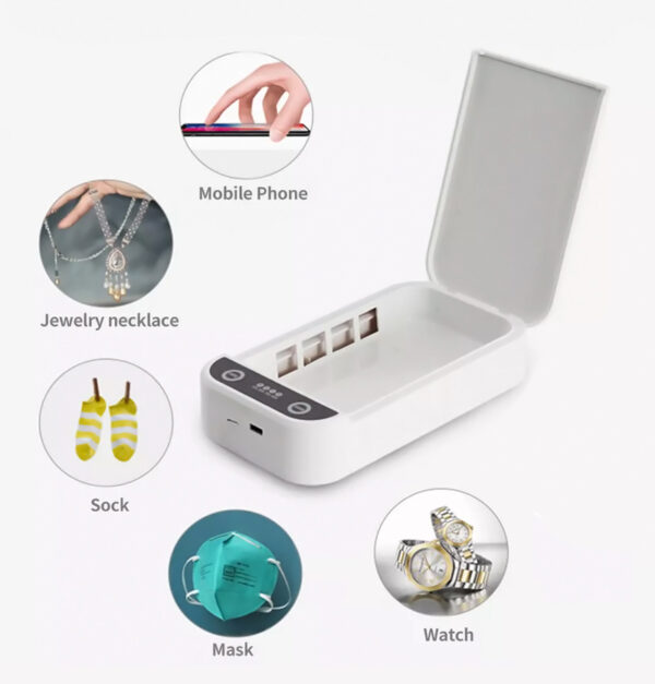 Αποστειρωτής υπεριώδους ακτινοβολίας για αποστείρωση κινητών τηλεφώνων, κοσμημάτων, κλειδιών και άλλων αντικειμένων σε ελάχιστο χρόνο.Εξοπλισμένος με λυχνία UV υπεριώδους ακτινοβολίας που εξοντώνει γρήγορα το 99,99% των μικροοργανισμών.Είναι κατάλληλο για αποστείρωση κινητών έως 6” και αποστειρώνει με ασφαλή τρόπο ηλεκτρονικές συσκευές χωρίς να επηρεάζει τη λειτουργία τους ή να τις βάζει σε κίνδυνο.