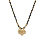 Ατσάλινο κολιέ με εντυπωσιακή μεταλλική καρδιά σε υφασμάτινο κορδόνι. Ο συνδυασμός του χρυσού χρώματος με το μαύρο-καφέ κορδόνι προσθέτει μοντέρνο και boho χαρακτήρα σε κάθε εμφάνιση.Μήκος: 40 + 6 cm