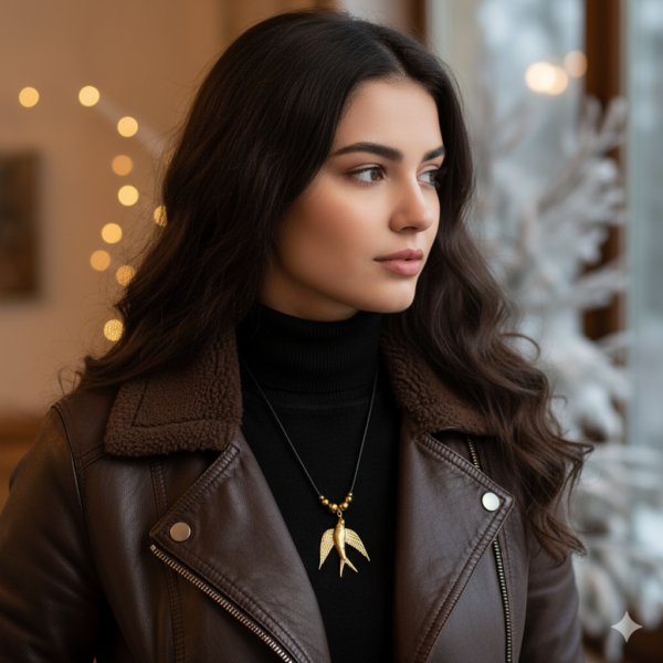 Ατσάλινο κολιέ με μαύρο κορδόνι και χρυσό μενταγιόν σε σχήμα χελιδονιού. Κομψό και συμβολικό, αποπνέει ελευθερία και θετική ενέργεια — ιδανικό για κάθε εποχή.Μήκος: 70 cmΜέγεθος μενταγιόν: 5 cm