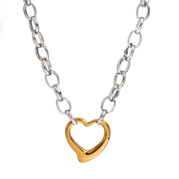 Ατσάλινο κολιέ με εντυπωσιακή χοντρή αλυσίδα και κεντρικό μοτίφ σε σχήμα καρδιάς. Ένα bold και μοντέρνο σχέδιο που αναδεικνύει κάθε εμφάνιση, ιδανικό για layering ή για statement look. Μήκος αλυσίδας 42+6cm για προσαρμοζόμενη εφαρμογή.