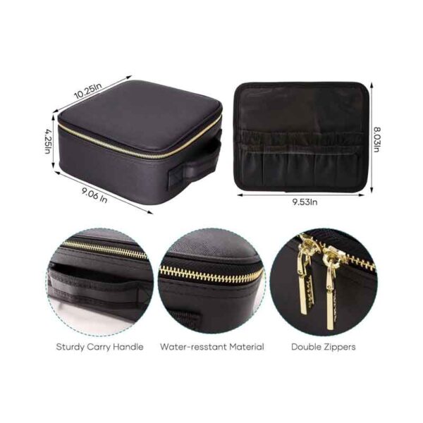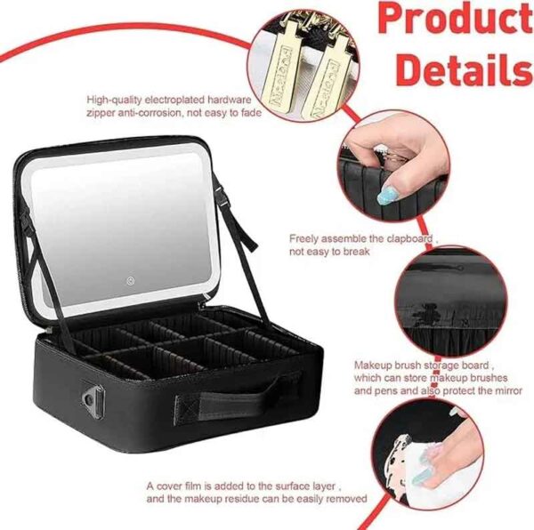 Η τσάντα καλλυντικών ταξιδιού είναι κατασκευασμένη από φιλικό προς το περιβάλλον συνθετικό δέρμα. Διαθέτει αποσπώμενα χωρίσματα και προσφέρει έναν τρίχρωμο καθρέφτη LED για το τέλειο μακιγιάζ σας. Είναι βολικό για μεταφορά και αποτελεί ιδανικό δώρο για τους λάτρεις της ομορφιάς.Κατάλληλο για οικιακή και ταξιδιωτική χρήση.