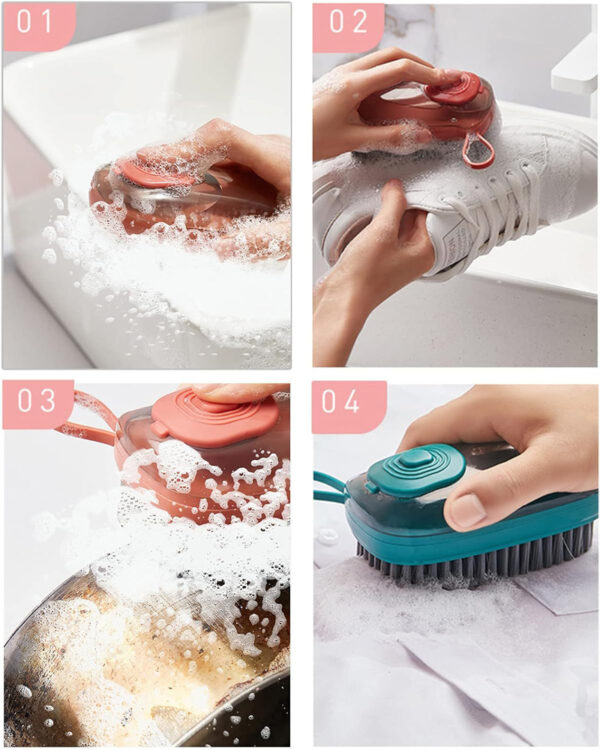 Βούρτσα καθαρισμού, ιδανική για τον υγρό καθαρισμό παπουτσιών, ρούχων, σκευών κ.α. Διαθέτει ανθεκτικές τρίχες σιλικόνης και ενσωματώνει δοχείο για την τοποθέτηση υγρού απορρυπαντικού.