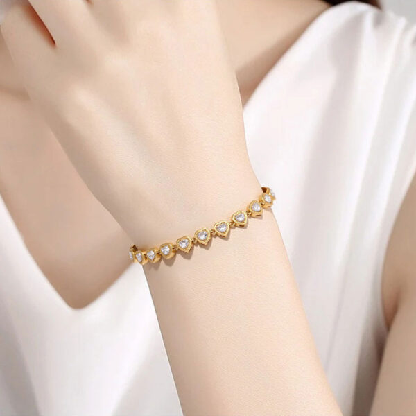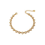 Λαμπερό βραχιόλι τύπου riviera από ανοξείδωτο ατσάλι σε χρυσή απόχρωση, διακοσμημένο με συνεχή σειρά από μικρές καρδιές με λευκές πέτρες. Το σχέδιο δημιουργεί μια κομψή, φωτεινή γραμμή γύρω από τον καρπό, προσφέροντας ρομαντική αλλά και διακριτική λάμψη σε κάθε εμφάνιση.Με μήκος 16+4 cm, εφαρμόζει άνετα και ρυθμίζεται εύκολα. Ανθεκτικό, υποαλλεργικό και ιδανικό για καθημερινή χρήση ή πιο elegant περιστάσεις, αποτελεί μία ξεχωριστή και θηλυκή πρόταση για κάθε συλλογή κοσμημάτων.