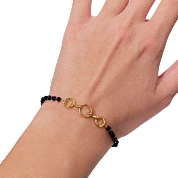Κομψό βραχιόλι από ανοξείδωτο ατσάλι με μαύρες χάντρες και διακοσμητικούς κρίκους στο κέντρο. Ιδανικό για καθημερινή χρήση ή για να προσθέσει μία μοντέρνα λεπτομέρεια σε βραδινές εμφανίσεις. Διαθέσιμο σε χρυσό και ασημί χρώμα.