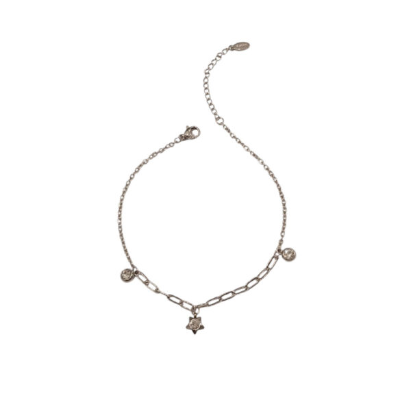 κομψό βραχιόλι ποδιού με λεπτή αλυσίδα, αστεράκι στο κέντρο με διακριτικό στρας και δύο πλαϊνά ζιρκόν. διαθέσιμο σε χρυσό και ασημί χρώμα, με ρυθμιζόμενο μήκος και κούμπωμα ασφαλείας. ιδανικό για καθημερινές ή πιο λαμπερές εμφανίσεις, προσθέτει διακριτική λάμψη και ρομαντική διάθεση στο καλοκαιρινό σου στυλ.