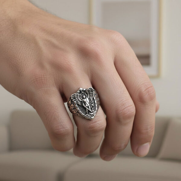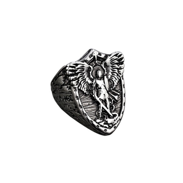 Εντυπωσιακό ανδρικό δαχτυλίδι από ανοξείδωτο ατσάλι με ανάγλυφη παράσταση του Αρχάγγελου Μιχαήλ σε ασπίδα και λεπτομέρειες με τη φράση “St. Michael Protect Us” στο πλάι προσφέροντας ένα δυνατό σύμβολο προστασίας και πίστης σε vintage στυλ που ξεχωρίζει σε κάθε εμφάνιση