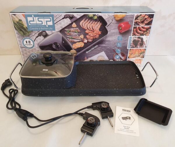 Συσκευή μαγειρέματος 2 σε 1 της DSP με Grill-Barbeque και ενσωματωμένη κατσαρόλα 2 τμημάτων με καπάκι. Μία επαναστατική πολυλειτουργική συσκευή που θα σας λύσει τα χέρια καθώς σας επιτρέπει να μαγειρεύετε εύκολα, γρήγορα και οικονομικά έως και 3 παρασκευές ταυτόχρονα χωρίς την χρήση πολλών σκευών και εστιών κουζίνας.