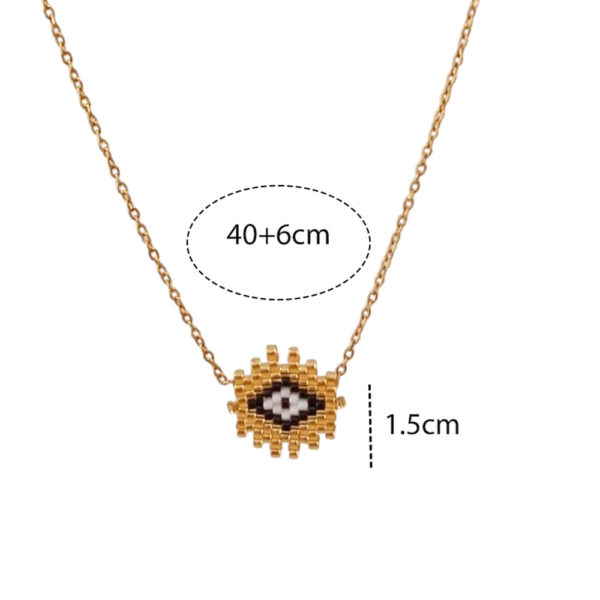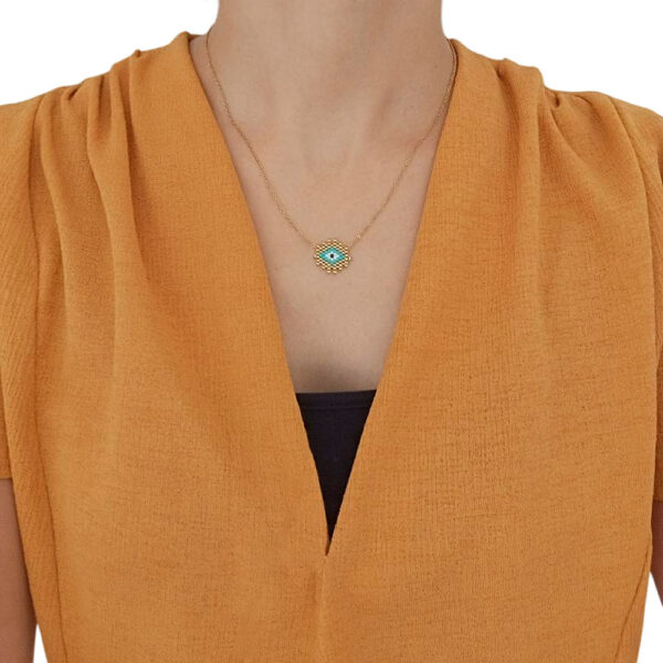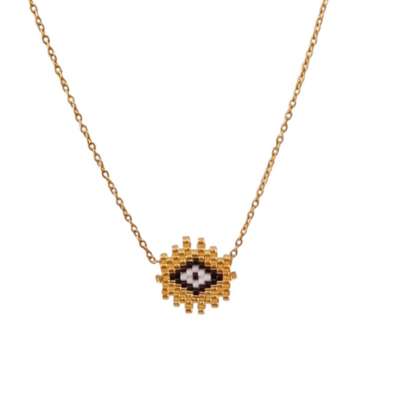 Εντυπωσιακό κολιέ από ανοξείδωτο ατσάλι με μοτίφ ματάκι, φτιαγμένο από πολύχρωμες χάντρες Miyuki. Ένα διακριτικό αλλά και προστατευτικό σύμβολο που προσθέτει boho και μοντέρνα πινελιά σε κάθε εμφάνιση. Ιδανικό για καθημερινή χρήση ή ως ξεχωριστό δώρο. Διατίθεται σε μαύρο, μπλε και τυρκουάζ.