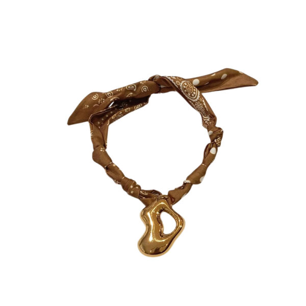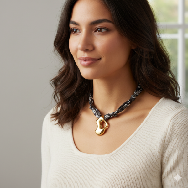 Στυλάτο κολιέ με μαντήλι και αφηρημένο χρυσό μενταγιόν σε ρευστή, οργανική φόρμα. Ένα fashion-forward κομμάτι που συνδυάζει boho και urban αισθητική, προσφέροντας άμεσο statement αποτέλεσμα.Το υφασμάτινο μαντήλι προσθέτει χρώμα και υφή, ενώ το χρυσό μενταγιόν δίνει λάμψη και μοντέρνο χαρακτήρα. Ιδανικό για να απογειώσει κάθε casual ή chic εμφάνιση.