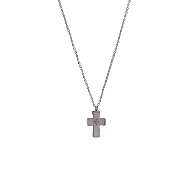 Κομψό κολιέ με σταυρό από ανθεκτικό ατσάλι, ιδανικό για καθημερινή χρήση ή ως διακριτικό σύμβολο πίστης. Ο σταυρός διαθέτει γυαλιστερή επιφάνεια από φίλντισι σε ροζ ή λευκή απόχρωση, προσδίδοντας διακριτική λάμψη και κομψότητα.Το ατσάλι εξασφαλίζει ανθεκτικότητα στον χρόνο και δεν μαυρίζει, ενώ η αλυσίδα εφαρμόζει όμορφα στον λαιμό, αναδεικνύοντας το μενταγιόν.Ιδανικό δώρο για κάθε περίσταση.