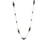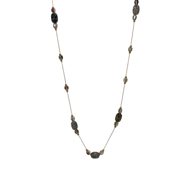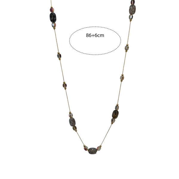 Κομψό και διαχρονικό μακρύ κολιέ με γκρι και ιριδίζουσες χάντρες, σε συνδυασμό με διακριτικά χρυσά στοιχεία. Οι ουδέτεροι τόνοι του το κάνουν ιδανικό για κάθε εποχή και κάθε περίσταση, από καθημερινές εμφανίσεις έως πιο επίσημες.Προσφέρει διακριτική λάμψη και ένα minimal–chic αποτέλεσμα που ταιριάζει εύκολα με κάθε στυλ.