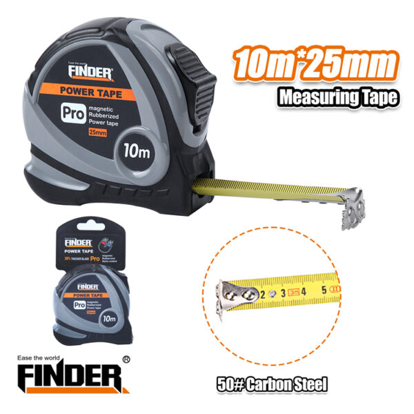 Μετροταινία 10m x 25mm, Finder, με αυτόματο μάζεμα, λουράκι μεταφοράς και κουμπί Stop.