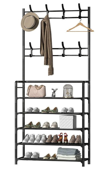 Παπουτσοθήκη με 5 ράφια για την αποθήκευση και οργάνωση των παπουτσιών σας. Διαθέτει μεταλλικό συναρμολογούμενο σκελετό και στο πάνω μέρος της εξοπλίζεται με κρεμάστρα για την αποθήκευση ρούχων και άλλων προσωπικών αντικειμένων.
