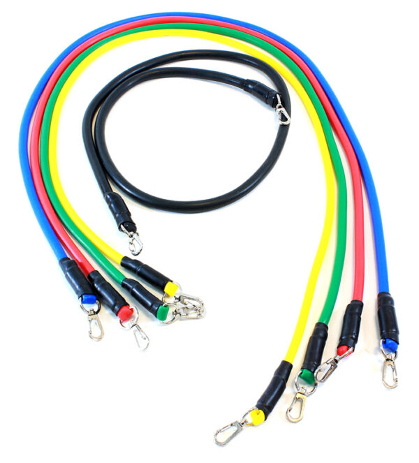 Σετ 5 ελαστικών ελατηρίων αντίστασης, διαφορετικού χρώματος και αντίστασης. Εξοπλίζονται με 2 διαφορετικά σετ ακρών (ιμάντες και χειρολαβές), προσφέροντας μεγαλύτερο εύρος ασκήσεων. Το σετ συνοδεύεται από μια καλαίσθητη και πρακτική θήκη μεταφοράς, ώστε να τα έχετε μαζί σας, οπουδήποτε.