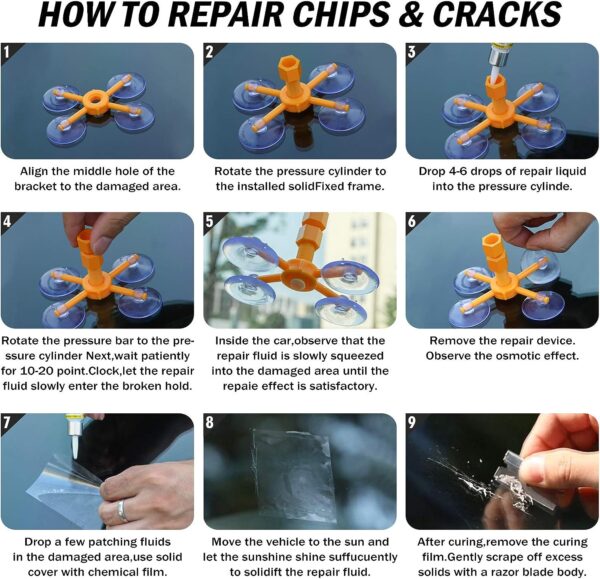 Επισκευάστε μικροζημιές και μικρά ραγίσματα στο παρμπρίζ σας, εύκολα γρήγορα και κύριως οικονομικά, με αυτό το πλήρες κιτ επισκευής κρυστάλλων αυτοκινήτου με ειδικό υγρό που θα ”γεμίσει” και σχεδόν θα εξαλείψει οποιαδήποτε γρατσουνιά ή ράγισμα υπέστη το παρμπρίζ σας. Μπορεί να επαναφέρει ράγισμα έως και 15cm. Το κιτ περιλαμβάνει: 1 * Συσκευή συγκράτησης με βεντούζες,