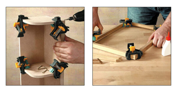 Σετ σφιγκτήρες γωνιών 90°, κατάλληλοι για την συγκράτηση γωνιών 90°. Κατάλληλοι για γωνίες και ενώσεις "Τ" ακόμη και σε τεμάχια διαφορετικού πάχους (5-22mm).