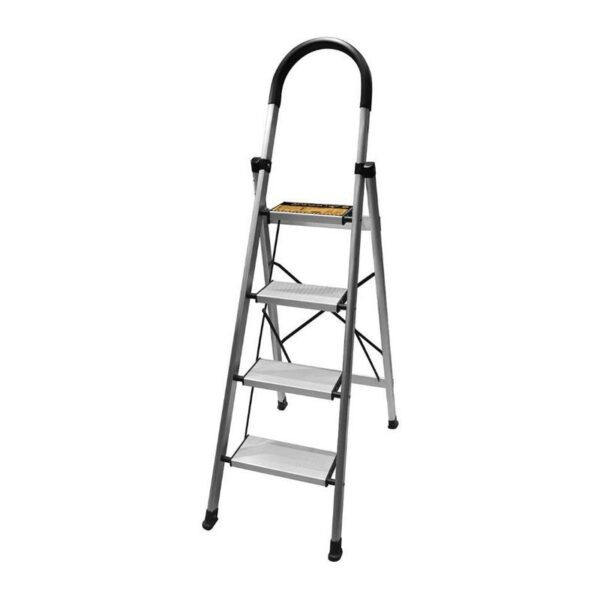 Αναδιπλούμενη σκάλα αλουμινίου 4 σκαλοπατιών, ιδανική για οικιακή και επαγγελματική χρήση. Κατασκευασμένη από ανθεκτικό υλικό, προσφέρει σταθερότητα και ασφάλεια κατά τη χρήση. Διαθέτει φαρδιά αντιολισθητικά σκαλοπάτια και εργονομική καμπυλωτή λαβή για επιπλέον στήριξη και ευκολία στη μεταφορά. Διπλώνει εύκολα για εξοικονόμηση χώρου κατά την αποθήκευση.