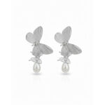Σκουλαρίκια Ατσάλι Ασημί με Διπλή Πεταλούδα Κρεμαστή Πέρλα και Στρας Stainless Steel Silver Butterfly Earrings with Pearl and Crystals