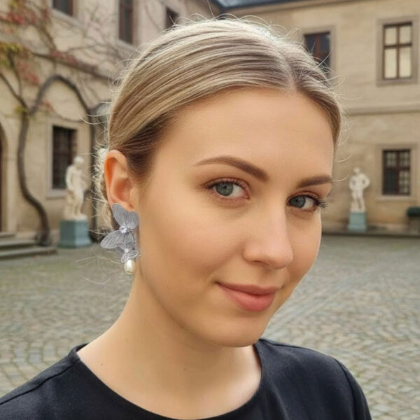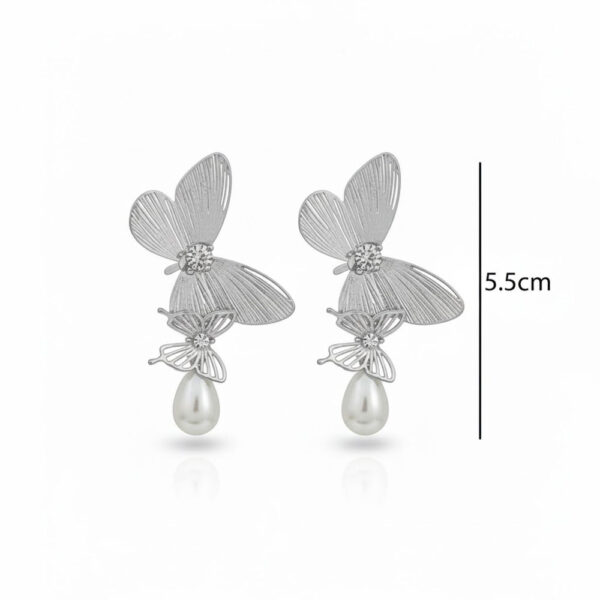Εντυπωσιακά σκουλαρίκια από ανοξείδωτο ατσάλι σε ασημί χρώμα, με κομψό σχέδιο διπλής πεταλούδας και διακριτικά στρας που χαρίζουν λάμψη και φινέτσα. Η κρεμαστή πέρλα προσθέτει ρομαντικό και θηλυκό χαρακτήρα, καθιστώντας τα ιδανική επιλογή για ιδιαίτερες εμφανίσεις αλλά και για κομψό καθημερινό στυλ. Υποαλλεργικά, ανθεκτικά στη φθορά και στο χρόνο, διατηρούν τη λάμψη τους χωρίς να μαυρίζουν. Μήκος περίπου 5,5 εκ. Ένα statement αξεσουάρ που αναδεικνύει κάθε look με διακριτική πολυτέλεια.