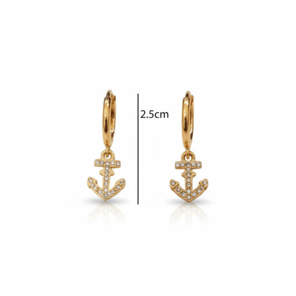 Εντυπωσιακά σκουλαρίκια κρίκοι από ανοξείδωτο ατσάλι με κρεμαστή άγκυρα διακοσμημένη με λαμπερές πέτρες, που προσδίδουν ναυτικό χαρακτήρα και κομψή λάμψη στο look. Ανθεκτικά, ελαφριά και άνετα στη χρήση, με συνολικό μήκος περίπου 2,5 cm, ιδανικά για καθημερινές αλλά και πιο ιδιαίτερες εμφανίσεις.