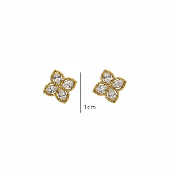 Κομψά σκουλαρίκια καρφωτά από ανοξείδωτο ατσάλι, με περίτεχνο μοτίβο λουλουδιού διακοσμημένο με λαμπερούς κρυστάλλους σε κοπή δάκρυ που αναδεικνύουν τη λάμψη και τη θηλυκότητα του σχεδίου. Το διακριτικό τους μέγεθος επιτρέπει άνετη καθημερινή χρήση, ενώ η elegant εμφάνιση τα κάνει ιδανικά για πιο ιδιαίτερες περιστάσεις. Ένα λεπτεπίλεπτο αξεσουάρ που προσθέτει φινέτσα και φωτεινές πινελιές σε κάθε σύνολο.
