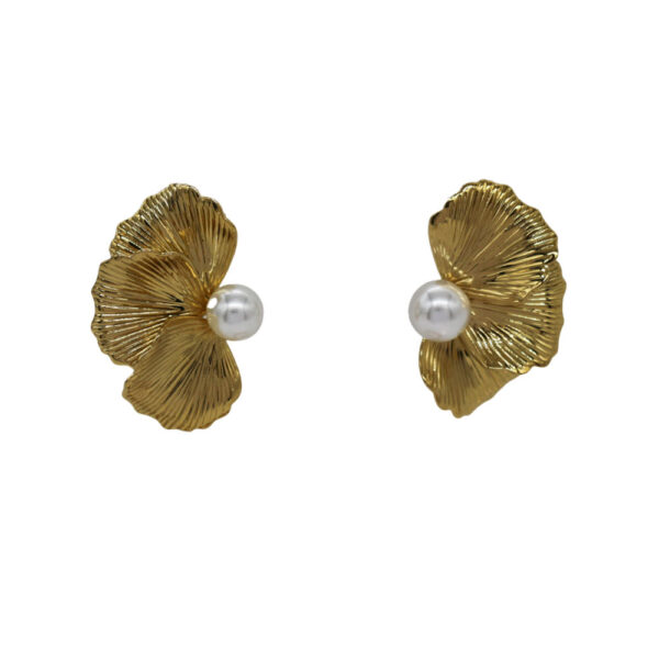 Εντυπωσιακά σκουλαρίκια σε χρυσό χρώμα με ανάγλυφο σχέδιο φύλλου και κεντρική πέρλα, κατασκευασμένα από ανοξείδωτο ατσάλι (stainless steel) για αντοχή και διαχρονική λάμψη. Με μήκος περίπου 5 cm, αγκαλιάζουν όμορφα το αυτί και αναδεικνύουν το πρόσωπο, προσθέτοντας statement κομψότητα σε κάθε εμφάνιση. Ιδανικά για βραδινές εξόδους και ιδιαίτερες περιστάσεις, αποτελούν ένα κομψό και μοντέρνο αξεσουάρ που ξεχωρίζει.