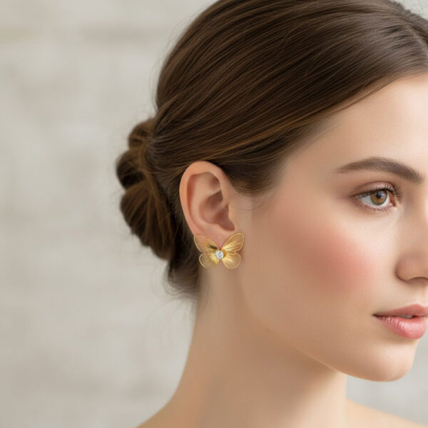 Κομψά σκουλαρίκια πεταλούδα από ανοξείδωτο ατσάλι σε χρυσό χρώμα, με λεπτομέρειες στυλ σύρμα και λαμπερή λευκή πέτρα στο κέντρο. Το φίνο σχέδιό τους προσδίδει διακριτική λάμψη και ρομαντική αισθητική, ιδανική για καθημερινές αλλά και πιο ιδιαίτερες εμφανίσεις. Ελαφριά, ανθεκτικά και υποαλλεργικά για άνετη χρήση όλη μέρα.