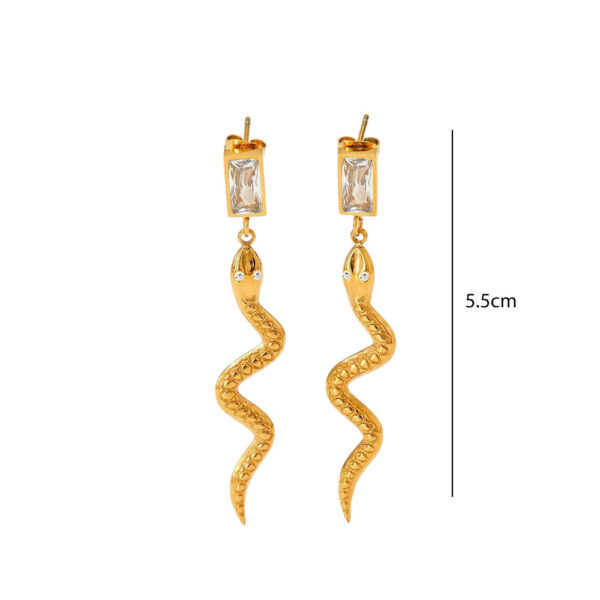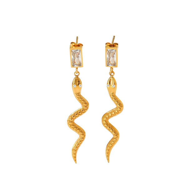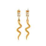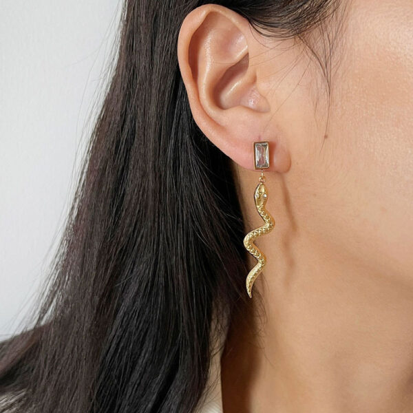 Εντυπωσιακά σκουλαρίκια από ανοξείδωτο ατσάλι σε χρυσό χρώμα, με ιδιαίτερο σχέδιο φιδιού και διακοσμητικό ορθογώνιο κρύσταλλο στο επάνω μέρος. Το ανάγλυφο σώμα και η κομψή κίνηση του σχεδίου δημιουργούν ένα statement αξεσουάρ που αποπνέει δυναμισμό και μοντέρνα αισθητική. Ιδανικά για να αναβαθμίσουν τόσο καθημερινά όσο και βραδινά σύνολα. Ανθεκτικά, υποαλλεργικά και άνετα στη χρήση, με συνολικό μήκος περίπου 5.5 cm.