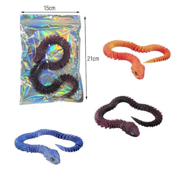 Τρισδιάστατο φίδι κατασκευασμένο με τεχνολογία 3D εκτύπωσης, με ακανθωτή υφή και εντυπωσιακό ρεαλιστικό σχεδιασμό. Κατασκευασμένο από εύκαμπτο και ανθεκτικό υλικό, λυγίζει εύκολα και μπορεί να πάρει διάφορα σχήματα χωρίς να παραμορφώνεται. Ιδανικό για παιχνίδι, συλλογή ή ως εντυπωσιακό διακοσμητικό αντικείμενο.