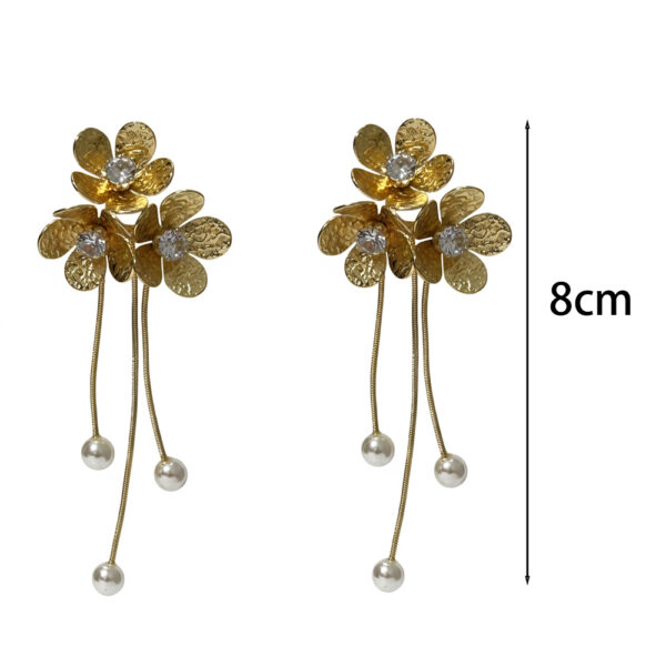 Εντυπωσιακά ατσάλινα σκουλαρίκια σε σχήμα λουλουδιού, διακοσμημένα με λαμπερούς κρυστάλλους στο κέντρο και πέρλες στις άκρες. Ο συνδυασμός της σφυρήλατης χρυσής υφής με τις λεπτές μεταλλικές απολήξεις χαρίζει ένα εκλεπτυσμένο και θηλυκό αποτέλεσμα. Ιδανικά για ιδιαίτερες περιστάσεις ή βραδινές εμφανίσεις, προσθέτουν λάμψη, κίνηση και κομψότητα σε κάθε στυλ. Ανθεκτικά, υποαλλεργικά και μοναδικά.