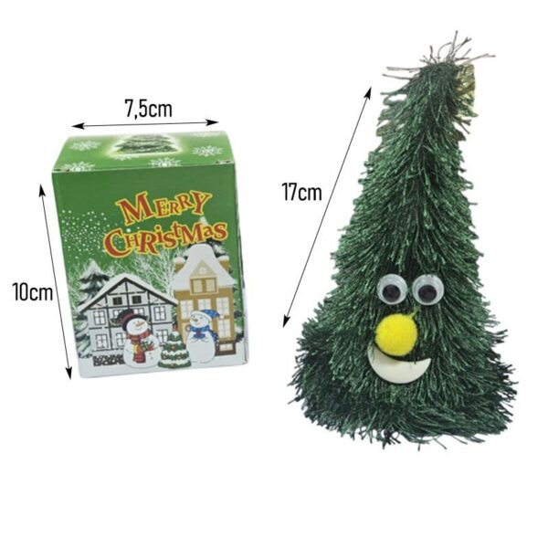 Διακοσμητικό χριστουγεννιάτικο δέντρο με κίνηση και μοναδικό σχέδιο προσώπου. Λειτουργεί με 3 μπαταρίες ΑΑ (δεν περιλαμβάνονται στη συσκευασία). Με ύψος 17cm, αποτελεί μια πρωτότυπη επιλογή για τον στολισμό του σπιτιού, του γραφείου ή ως ξεχωριστό δώρο που θα φέρει γιορτινή διάθεση και χαμόγελα.