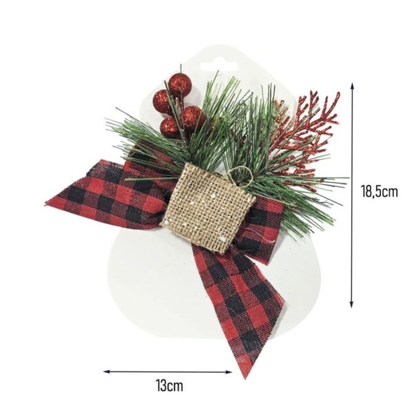 Χριστουγεννιάτικο διακοσμητικό κλαδί με κόκκινα μπαλάκια, φυσικό πράσινο φύλλωμα και καρό φιόγκο με λινάτσα. Ιδανικό για στολισμό δέντρου, στεφανιών, δώρων ή διακοσμητικών συνθέσεων. Συνδυάζει παραδοσιακά χρώματα και φυσική υφή, προσθέτοντας μια ζεστή και γιορτινή ατμόσφαιρα στον χώρο.