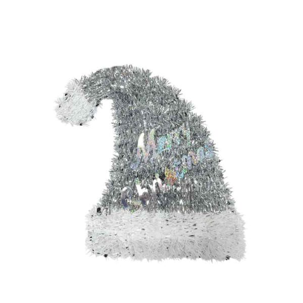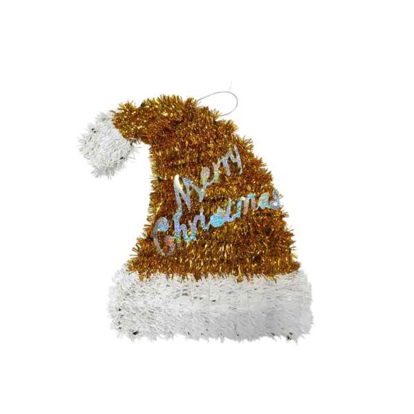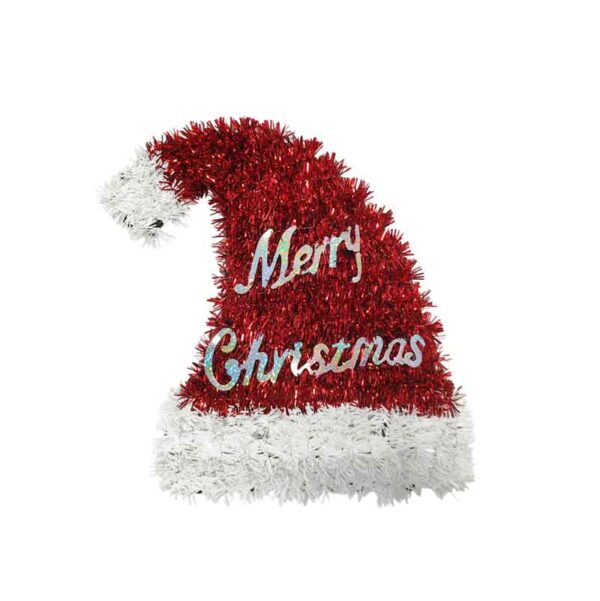 Διακοσμητικό καπέλο Άγιου Βασίλη από γιρλάντα με την επιγραφή “Merry Christmas”. Διαθέσιμο σε τρία χρώματα (κόκκινο, χρυσό και ασημί), προσθέτει εορταστική λάμψη σε κάθε χώρο. Ιδανικό για στολισμό τοίχου, πόρτας ή βιτρίνας.