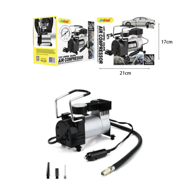 Το κομπρεσέρ αέρος Andowl Q-DQ993Ο είναι ιδανικό για μεταφορά λόγω του μικρού όγκου του. Λειτουργεί με έως και 35 λίτρα το λεπτό, είναι εξοπλισμένο με 4 ανθεκτικά ελαστικά πόδια με αντιολισθητική λειτουργία και διακόπτη on/off. Το προϊόν παρέχεται με τρεις αντάπτορες για βαλβίδες που σας επιτρέπουν να χρησιμοποιείτε τον συμπιεστή για άλλα αντικείμενα όπως μπάλα, φουσκωτό στρώμα, στρώμα παραλίας κ.λπ. Τροφοδοτείται στο αυτοκίνητο με πρίζα αναπτήρα και είναι δυνατός ο έλεγχος της πίεσης με τη βοήθεια του εγκατεστημένου μανόμετρου.