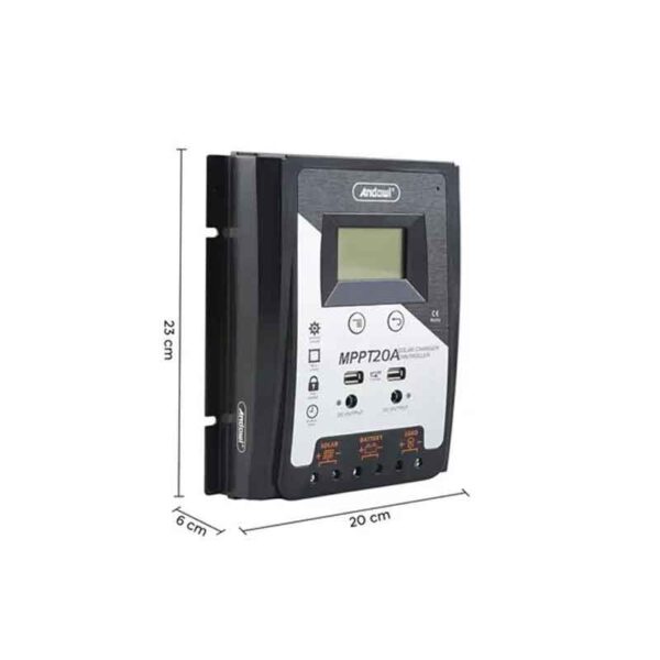 Ρυθμιστής φόρτισης για φωτοβολταϊκά panel με οθόνη LCD. Κατάλληλος για φωτοβολταϊκά συστήματα 12V ή 24V ισχύος 20A. Μεγάλη ευανάγνωστη LCD οθόνη για εύκολη απεικόνιση πληροφοριών όπως: ρεύμα φόρτισης, ρεύμα εκφόρτισης και τάση μπαταρίας. Είναι κατασκευασμένος από υψηλής ποιότητας υλικά και έχει μεγάλη αντοχή στη μακροχρόνια χρήση.