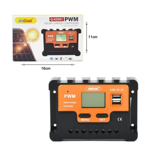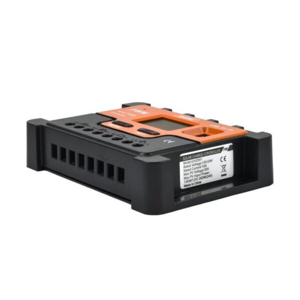 Ρυμιστής φόρτισης της εταιρίας Andowl κατάλληλος για εγκαταστάσεις μέχρι 10A στα 12V. Πρόκειται για τύπο PWM. Οι Ρυθμιστές φόρτισης PWM συνδέουν απλά το φωτοβολταϊκό πάνελ με τη μπαταρία (12/24/48V) καθιστώντας τους απλούς διακόπτες. Όταν ο διακόπτης κλείνει, η τάση του πάνελ εξισώνεται με αυτή της μπαταρίας. Το αποτέλεσμα είναι η τάση της συστοιχίας που μπορεί να δεχθεί ο PWM ρυθμιστής να εξαρτάται από την τάση της μπαταρίας και είναι μικρή, συνήθως ένα με δύο πάνελ των 100/200Wp σε σειρά και με αντίστοιχα μικρό ρεύμα φόρτισης σε σχέση με τις δυνατότητες ενός MPPT ρυθμιστή φόρτισης. Με βάση τα παραπάνω, οι PWM ρυθμιστές φόρτισης είναι ιδανικοί για μικρότερα συστήματα όπου η αποδοτικότητα του συστήματος δεν είναι τόσο σημαντικός παράγοντας και για ηλιακούς συλλέκτες με μέγιστη τάση ισχύος (Vmp) έως 18V για φόρτιση μπαταρίας 12V.