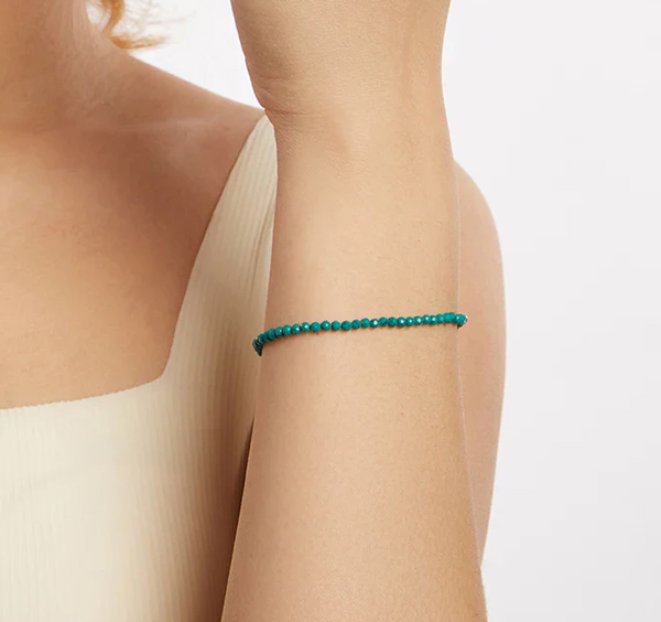 Κομψό βραχιόλι, διακοσμημένο με συνθετικές τουρκουάζ χάντρες, που προσφέρουν μοναδική λάμψη στο κόσμημα και προσδίδουν στυλ σε κάθε εμφάνιση.