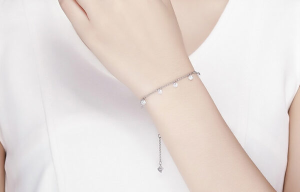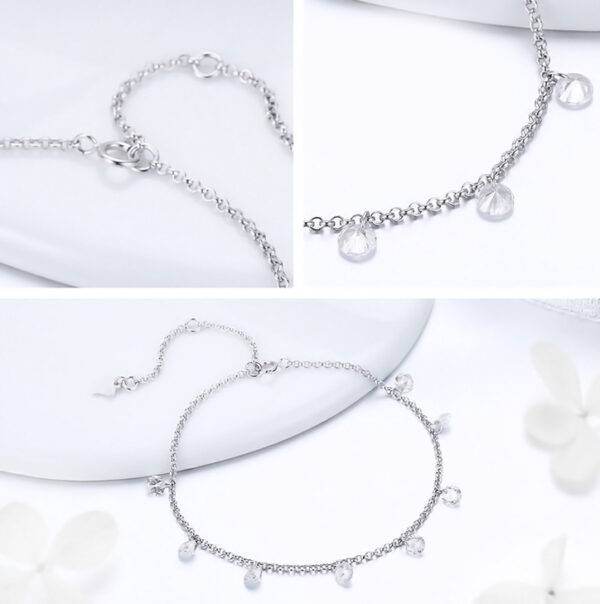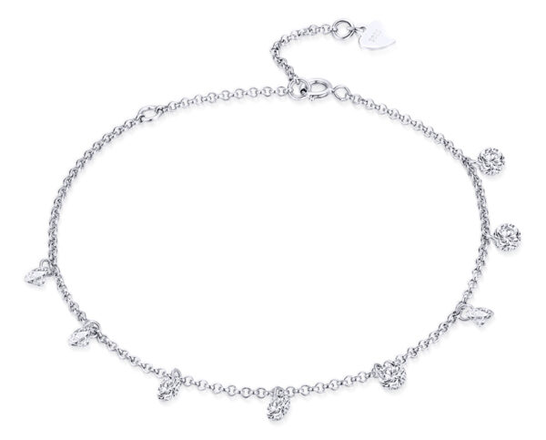 Κομψό βραχιόλι, διακοσμημένο με κρεμαστά κρύσταλλα κυβικής ζιρκόνιας, λευκού χρώματος τα οποία προσφέρουν μοναδική λάμψη στο κόσμημα.