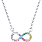 Εντυπωσιακό κολιέ με το σύμβολο του απείρου, σε ασημί χρώμα, διακοσμημένο με κυβική ζιρκόνια σε εντυπωσιακά χρώματα που προσφέρει εξαιρετική λάμψη στο κόσμημα.