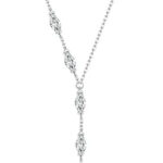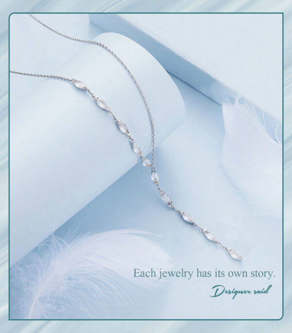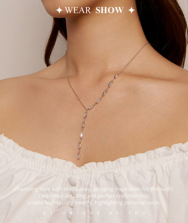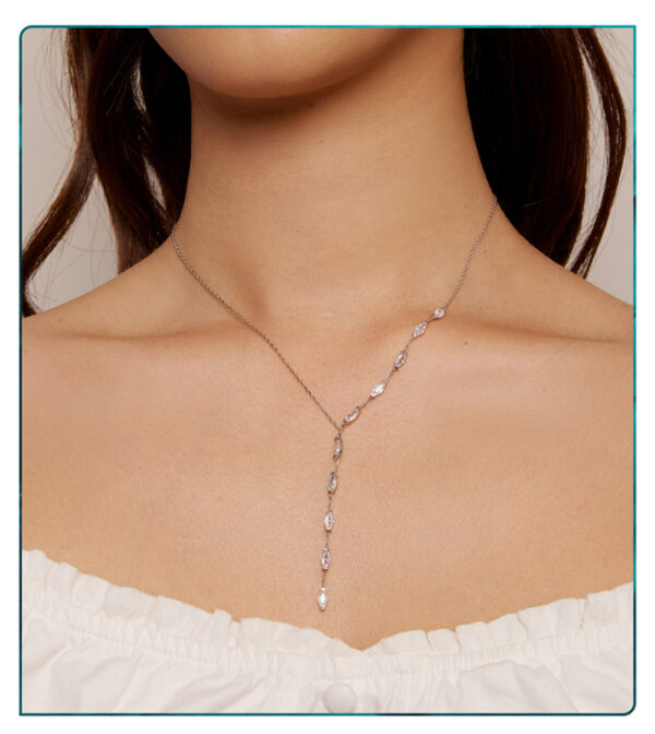 Εντυπωσιακό κολιέ σχήματος Y, σε ασημί χρώμα, διακοσμημένο με κυβική ζιρκόνια, λευκού χρώματος που προσφέρει εξαιρετική λάμψη στο κόσμημα.