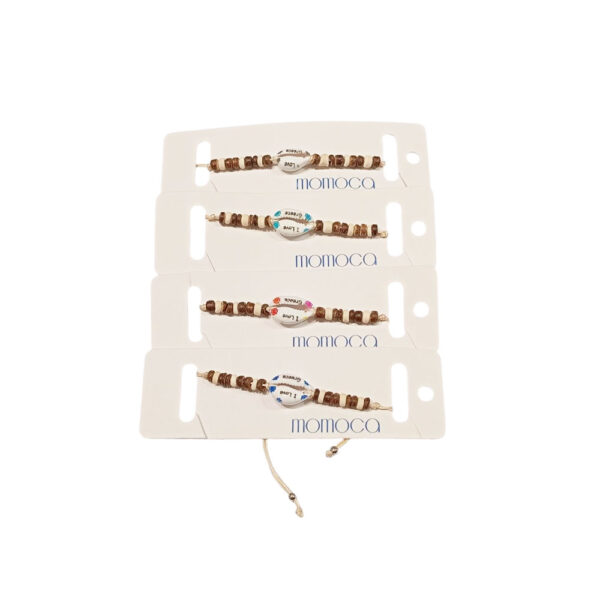 Χειροποίητα boho βραχιόλια με φυσικές ξύλινες χάντρες και λευκό κοχύλι στο κέντρο, διακοσμημένο με την επιγραφή “I Love Greece” και πολύχρωμες λεπτομέρειες. Το αυξομειούμενο κορδόνι σε ουδέτερους τόνους εξασφαλίζει τέλεια εφαρμογή για κάθε καρπό. Ιδανικό προϊόν για τουριστικά καταστήματα, αναμνηστικά ή καλοκαιρινά δώρα. Πωλείται σε σετ των 12 τεμαχίων με καρτελάκι.