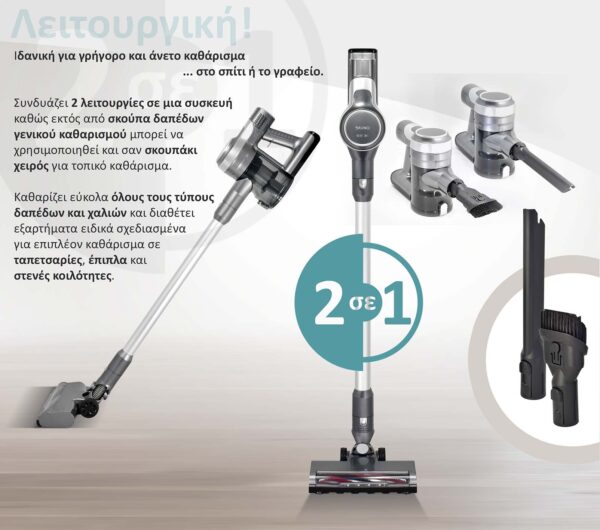 Συνδυάζει 2 λειτουργίες σε μια συσκευή καθώς μπορεί να χρησιμοποιηθεί σαν σκούπα δαπέδων γενικού καθαρισμού αλλά και σαν σκουπάκι χειρός για τοπικό καθάρισμα.