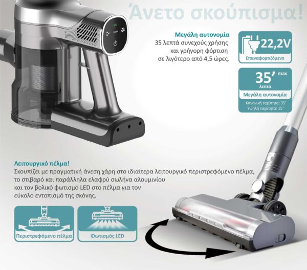 -Βασικές λειτουργίες: 2 σε 1. Καθάρισμα δαπέδων, χαλιών, επίπλων κτλ. Επιπλέον μπορεί να χρησιμοποιηθεί και σαν σκουπάκι χειρός.