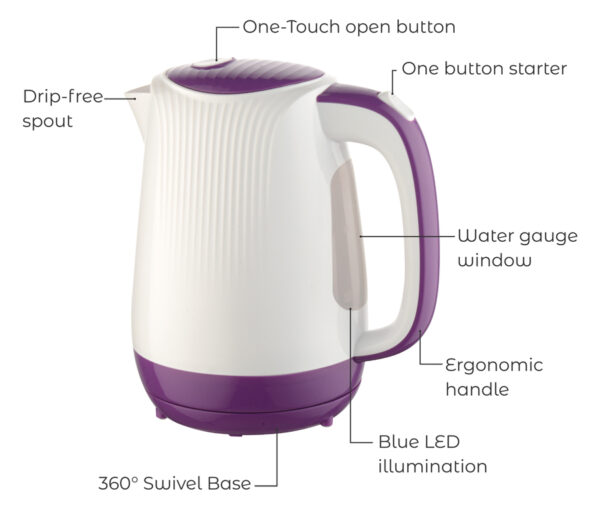 Ηλεκτρικός βραστήρας εξαιρετικής απόδοσης της BRUNO με ισχύ 2200W και χωρητικότητα 1,7 lt. Εξοπλίζεται με περιστρεφόμενη βάση 360°, εργονομική λαβή για εύκολο κράτημα αλλά και εντυπωσιακό εσωτερικό μπλε LED φωτισμό. Επιπλέον διαθέτει σύστημα ασφαλείας κατά του βρασμού χωρίς νερό και σύστημα αυτόματης διακοπής βρασμού.
