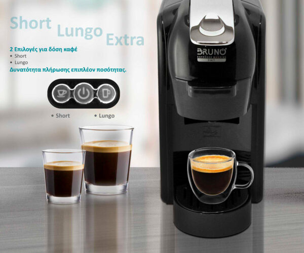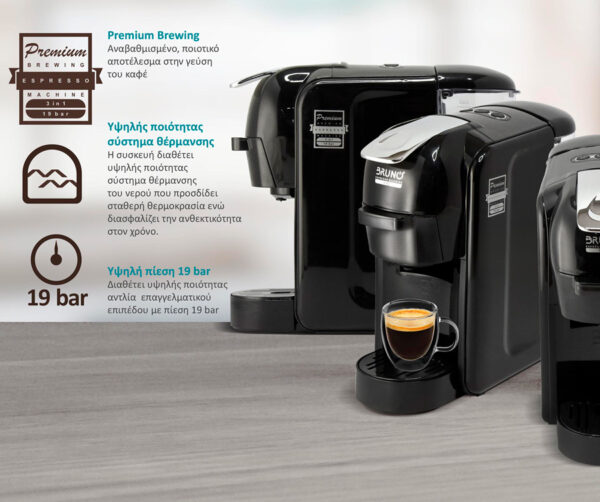 Η καφετιέρα espresso 3 σε 1 της Bruno, συνδυάζει 3 λειτουργίες σε μία συσκευή. Με 3 ειδικούς αντάπτορες που εφαρμόζονται πολύ εύκολα (συρταρωτά) στη συσκευή, μπορεί να παρασκευάσει καφέ χρησιμοποιώντας καφέ σε σκόνη ή κάψουλες τύπου Nespresso αλλά και Dolce Gusto καλύπτοντας έτσι τις δημοφιλέστερες επιλογές.