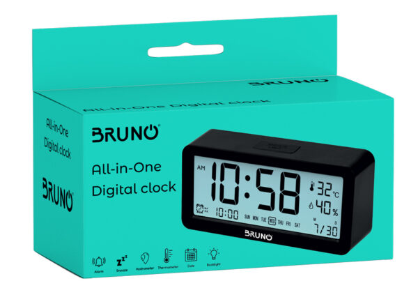 BRUNO ξυπνητήρι με μεγάλη ευανάγνωστη οθόνη και μέτρηση θερμοκρασίας και υγρασίας. Υποστηρίζει τριπλό ξυπνητήρι με το οποίο έχετε την δυνατότητα να ρυθμίσετε 3 διαφορετικές ώρες αφύπνισης και λειτουργία snooze. Διαθέτει οπίσθιο φωτισμό με το πάτημα ενός κουμπιού.