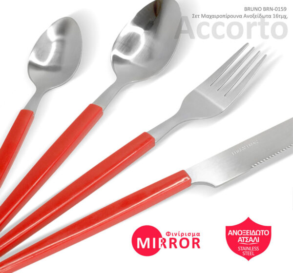 Σετ μαχαιροπίρουνα 16 τεμαχίων Accorto από την BRUNO, με πλαστική λαβή, κατασκευασμένα από ανοξείδωτο ατσάλι σε μοντέρνο σχέδιο και φινίρισμα "καθρέφτη".